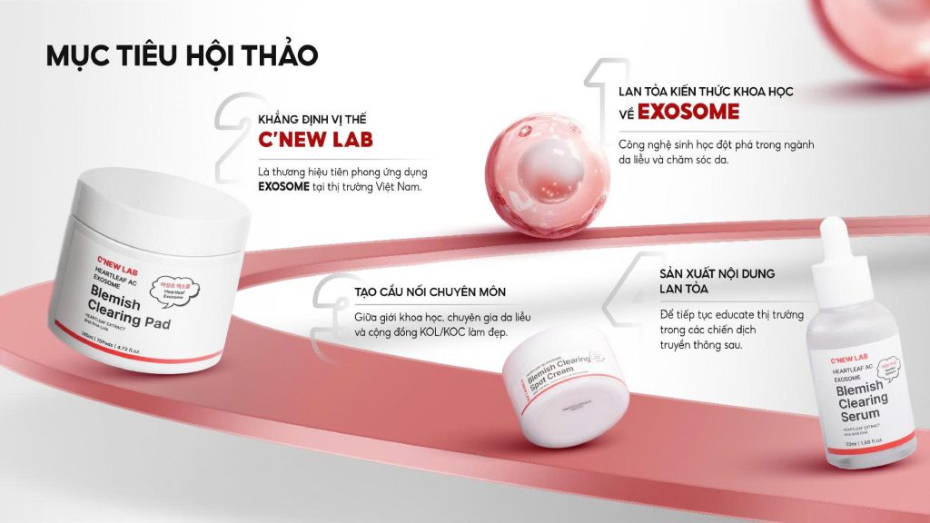 Sự kiện mang đến cái nhìn toàn diện về Exosome – bưu kiện sinh học mang tín hiệu phục hồi cho da, công nghệ sinh học đột phá được ứng dụng trong điều trị mụn, da nhạy cảm và chăm sóc da hiện đại. Đây cũng là dịp để C’New Lab khẳng định vị thế tiên phong trong việc đưa Exosome đến gần hơn với cộng đồng Việt Nam.