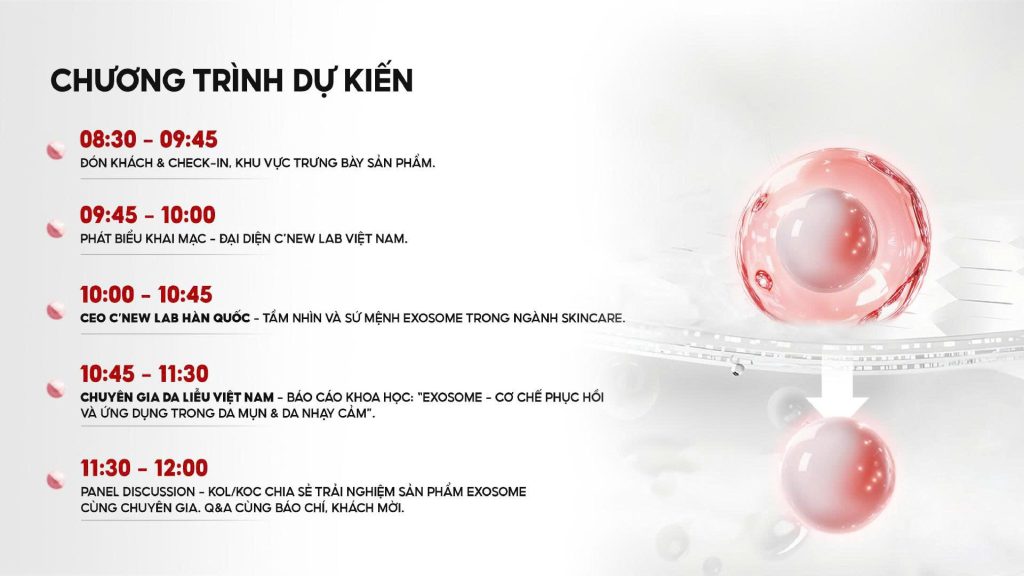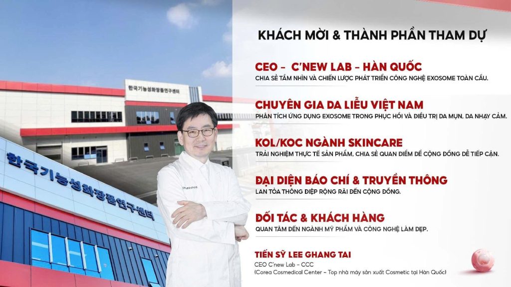 • 10:00 – 10:45: CEO C’New Lab Hàn Quốc – Tầm nhìn & sứ mệnh Exosome trong ngành skincare.