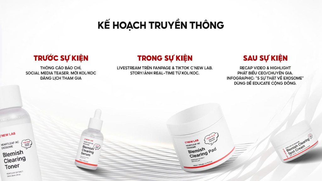 • Trong sự kiện: Livestream trên Fanpage & TikTok C’New Lab, cập nhật story/ảnh real-time từ KOL/KOC.